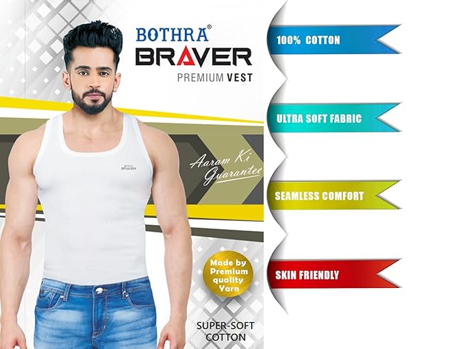 100% cotton vest for men with superior comfort and breathability. Ultra-soft fabric for a luxurious feel. Constructed with premium quality yarn for added durability. High sweat absorbency to keep you feeling fresh and dry. Long-lasting whiteness achieved through luminous bleach process. High durability fabric to withstand frequent wear and tear. Skin-friendly material suitable for all skin types. Twist-free quality for minimal fabric distortion. Easy Care: Designed for convenience, our Men's Vest is easy to care for and maintains its quality wash after wash. Reinforced seams for added strength and durability. Interlock piping for a sleek and polished finish. Itch-free comfort guaranteed.